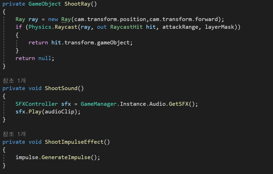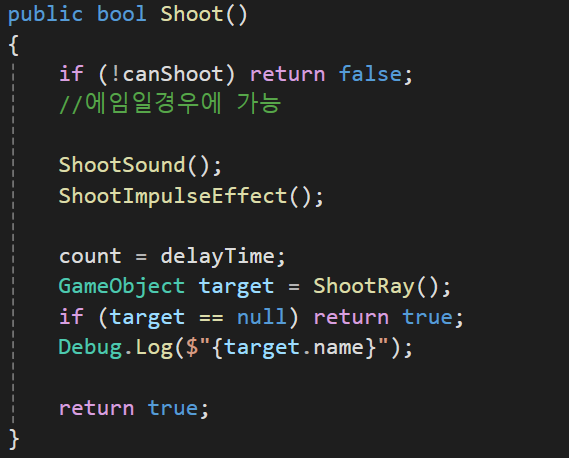 두 함수를 Shoot에 넣고, canShoot이 true일경우 함수를 지나 count가 delayTime으로 할당되고, ShootRay GameObject를 target에 할당, 그리고 raycast에 물체가 맞지 않아도 Shoot을 진행 했기때문에 true, 맞을경우 target의 이름이 출력 되도록 설정하였다.