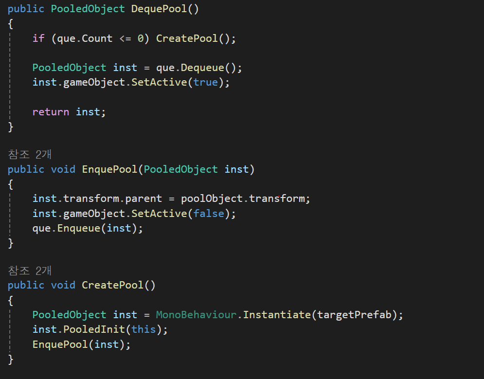 CreatePool에서 PooledObject를 Instantiate를 사용해서 생성하고, 해당 PooledObject의 속한 형식이 해당 오브젝트 풀로 정하고, EnquePool을 실행해서 부모객체를 지정, 비활성화, 큐에 넣어준다.
