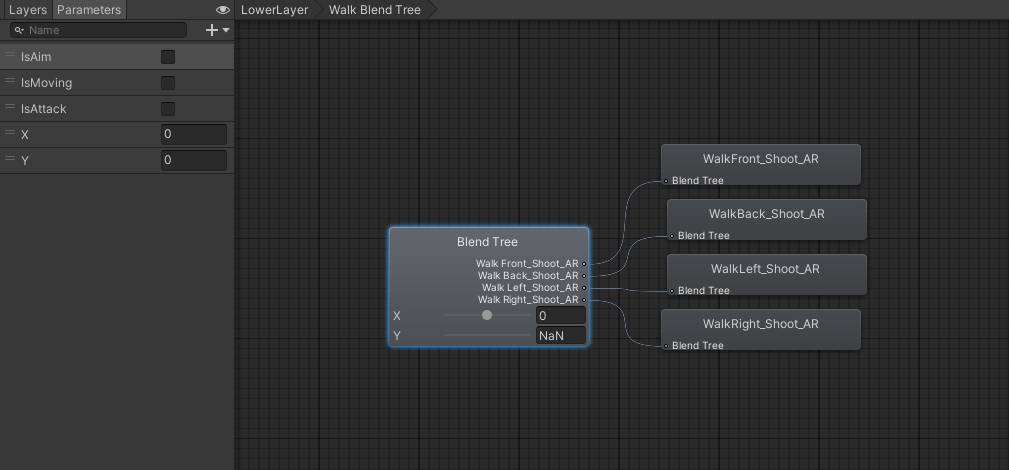 upper와 lower layer를 나눠서 애니메이션을 설정하고, blendTree를 사용해서 X,Y 값이 변경될 때 자연스러운 움직임을 설정 해주었다.