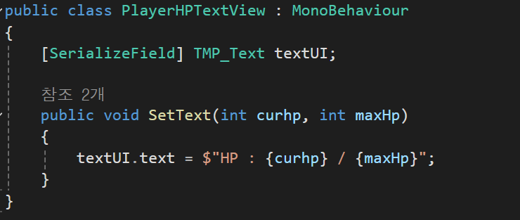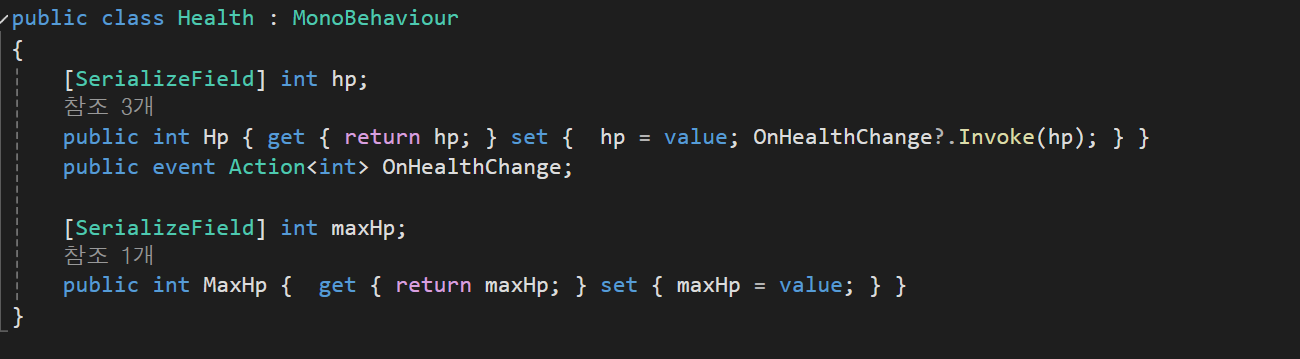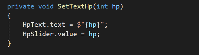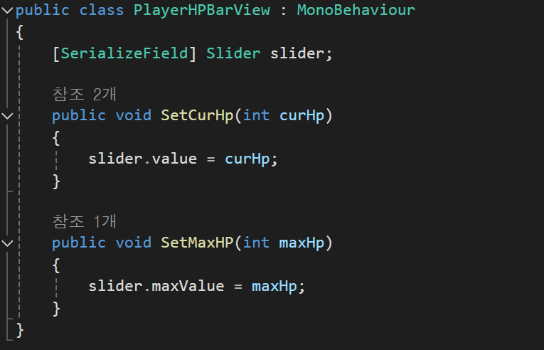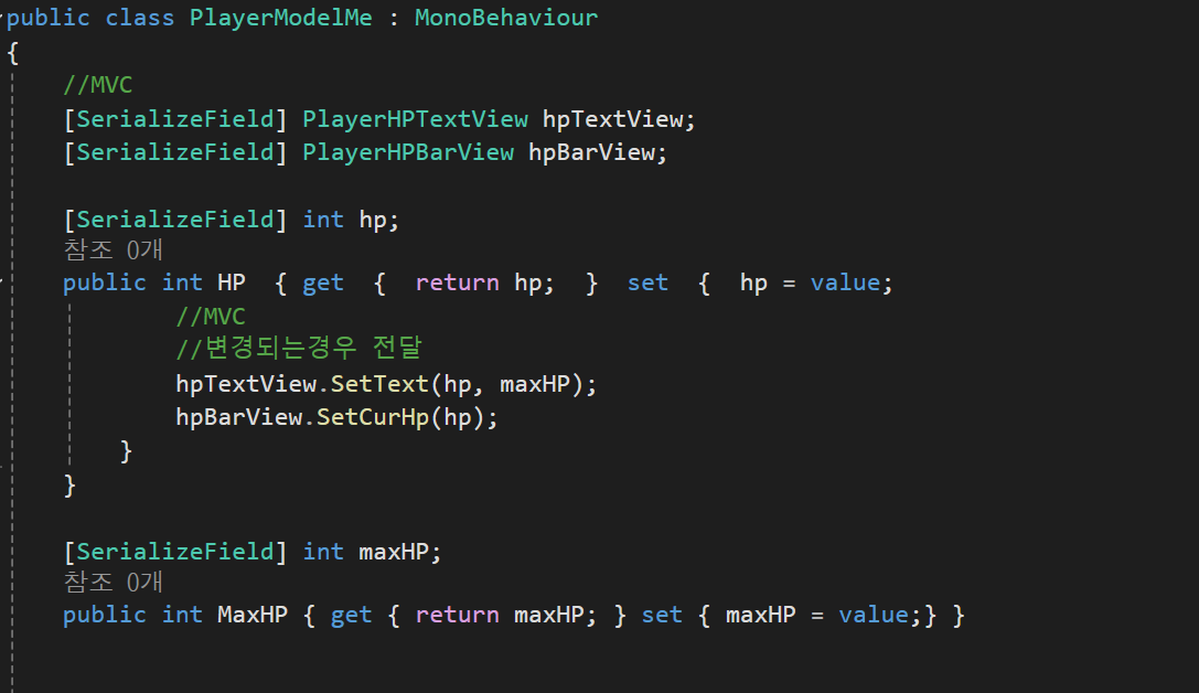 Model : hp,maxHp를 가지고 set에서 hp가 변경이 될 때마다 UI Script의 함수를 호출한다