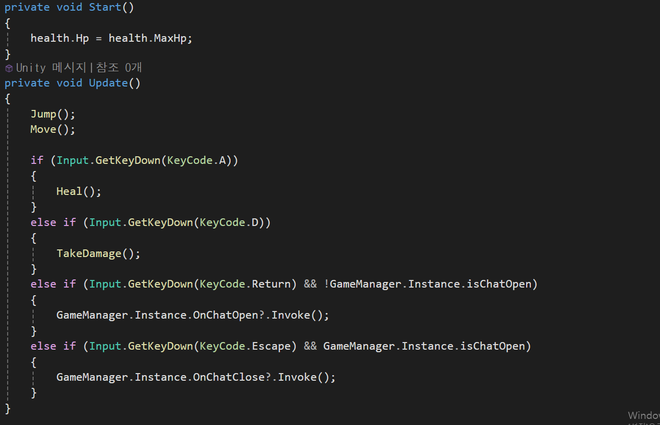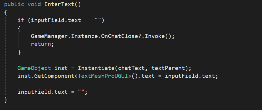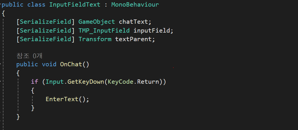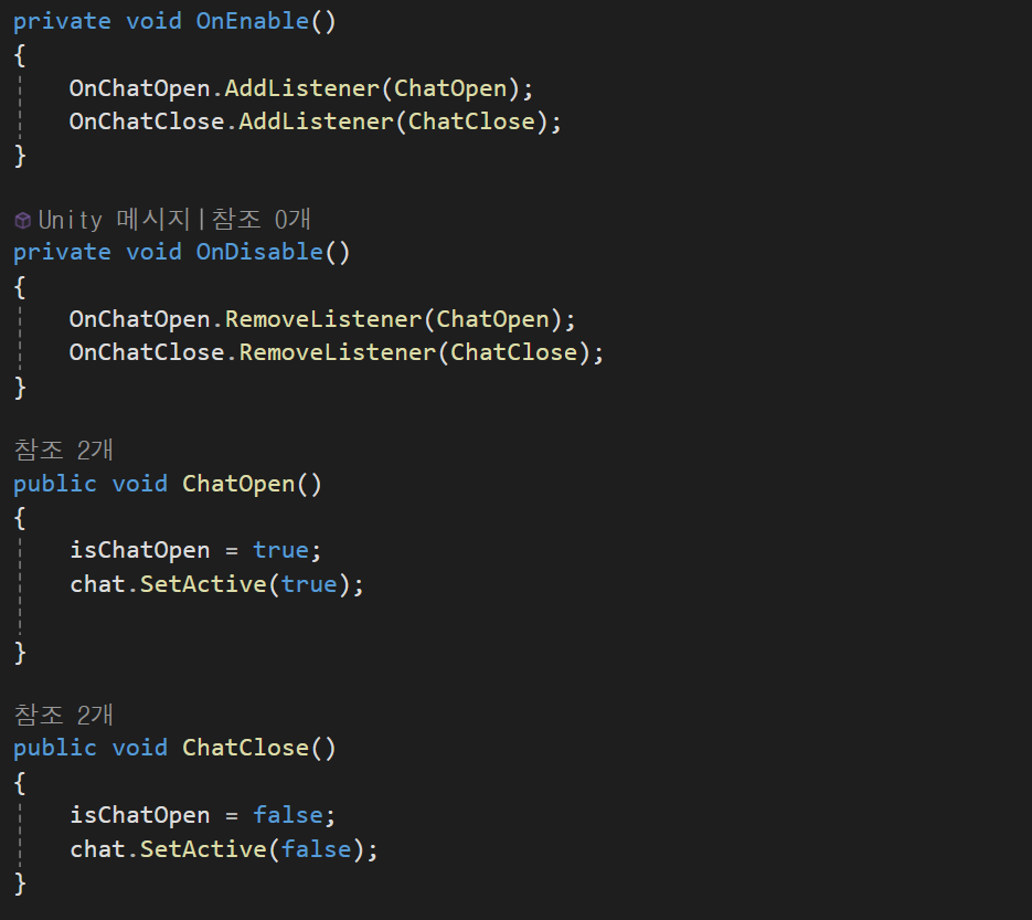 if문의경우 빈공간일경우에 EnterText함수가 실행 될 경우 싱글턴의 이벤트함수(OnChatClose)를 호출하도록 구현하였다.