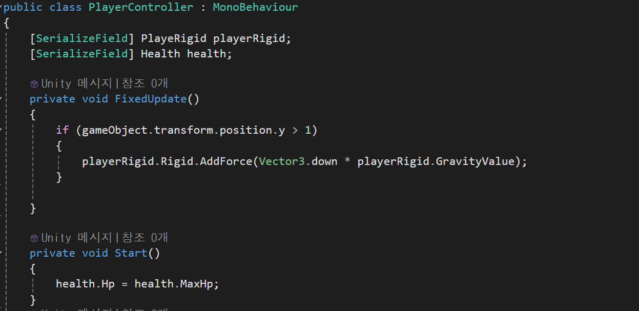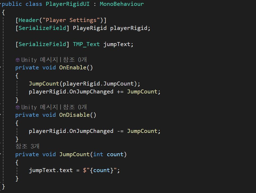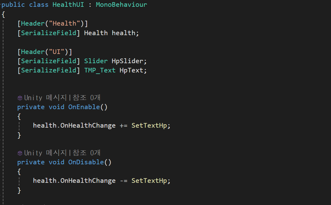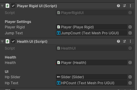 View : PlayerRigidUI, HealthUI를 사용해 UI를 지정하고 이벤트가 실행될 때 ui에 영향을 주도록 이벤트를 구독,취소 하도록한다.