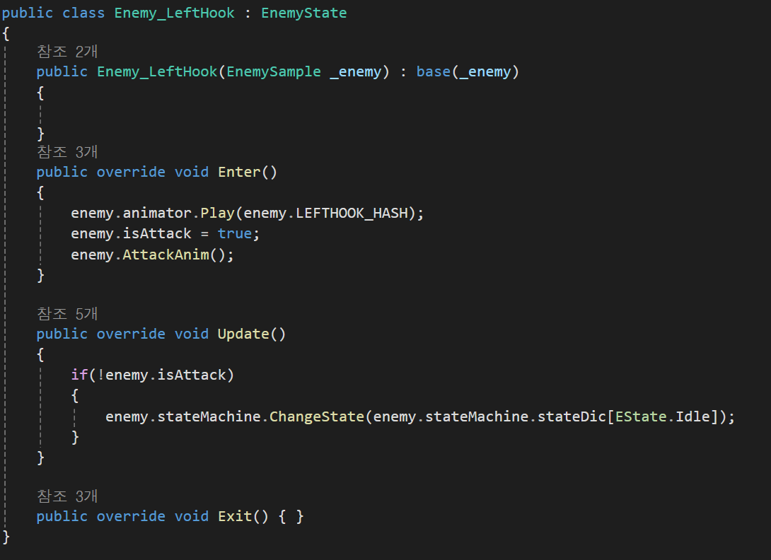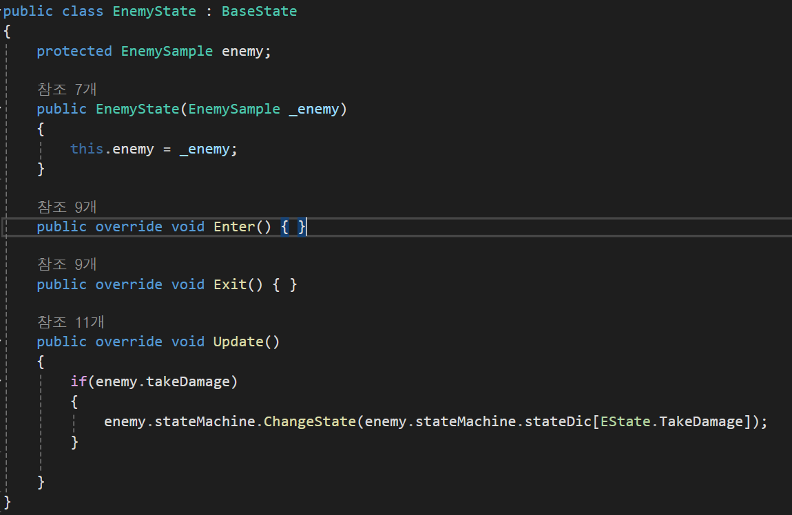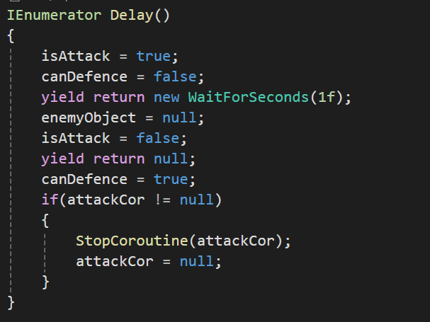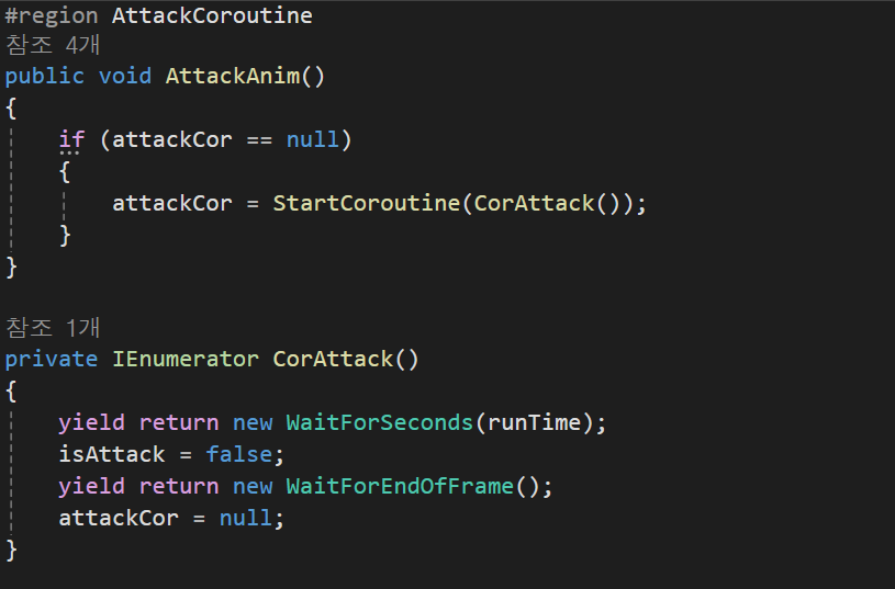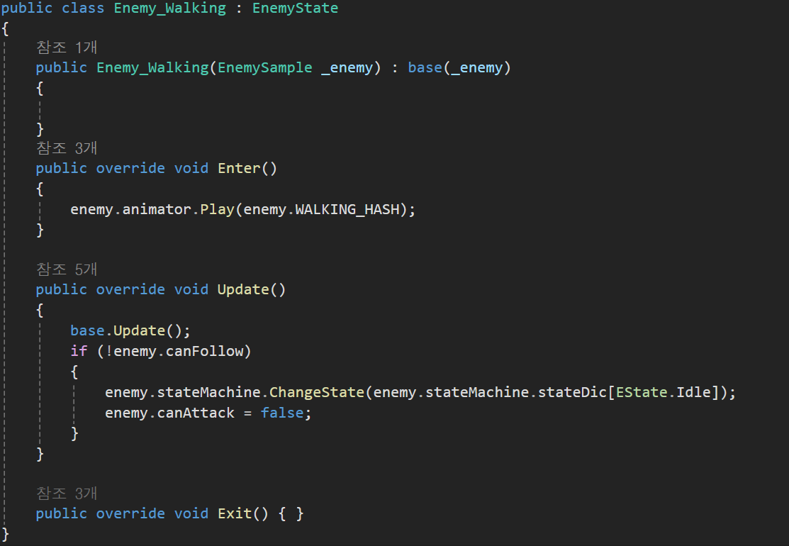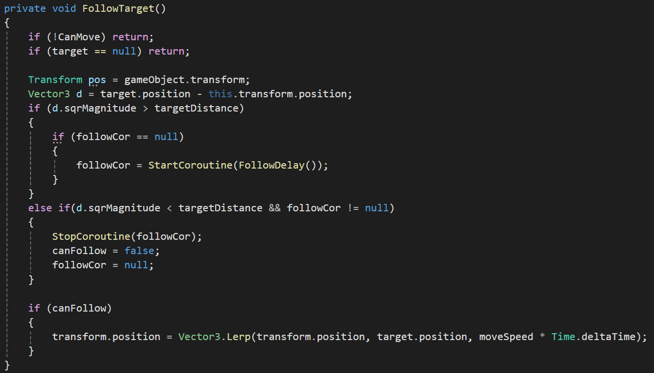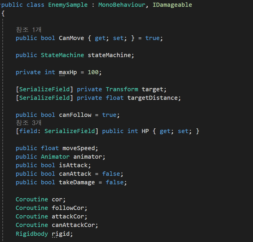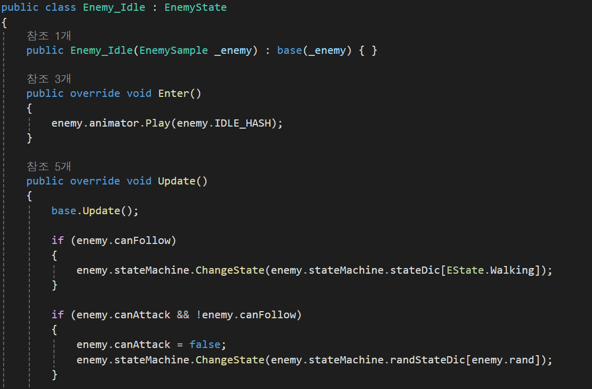 FollowTarget의 경우 시작시간을 넣고 해당 Coroutine에서 bool값을 조절해서 갈수 있는지 없는지를 조절해주었다(이부분은 StatePattern과 같이 맞춰야했지만 다른 부분에 시간을 더 써야하므로 enemy에 바로 구현했다)