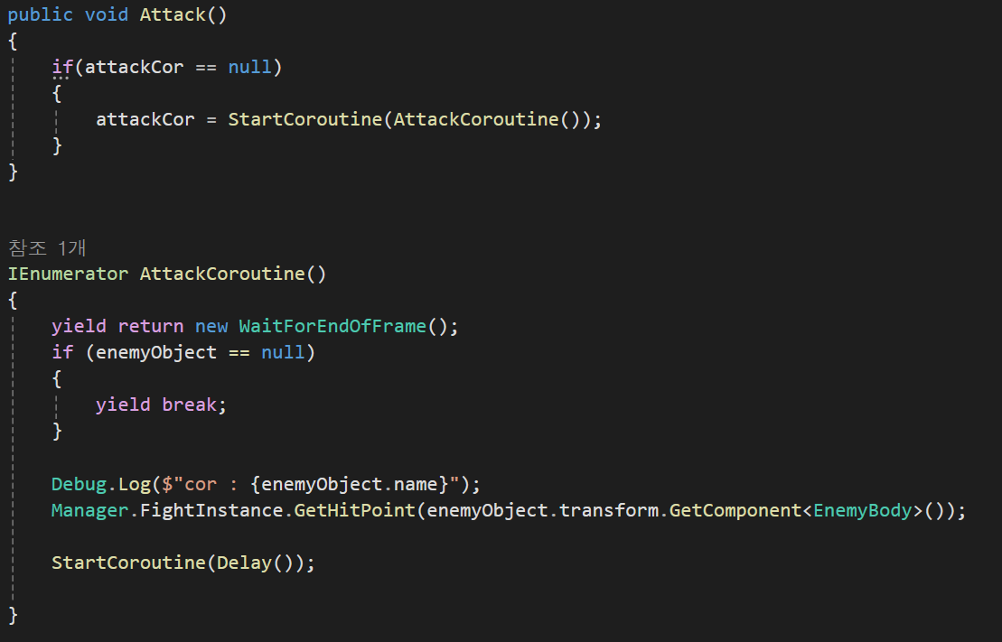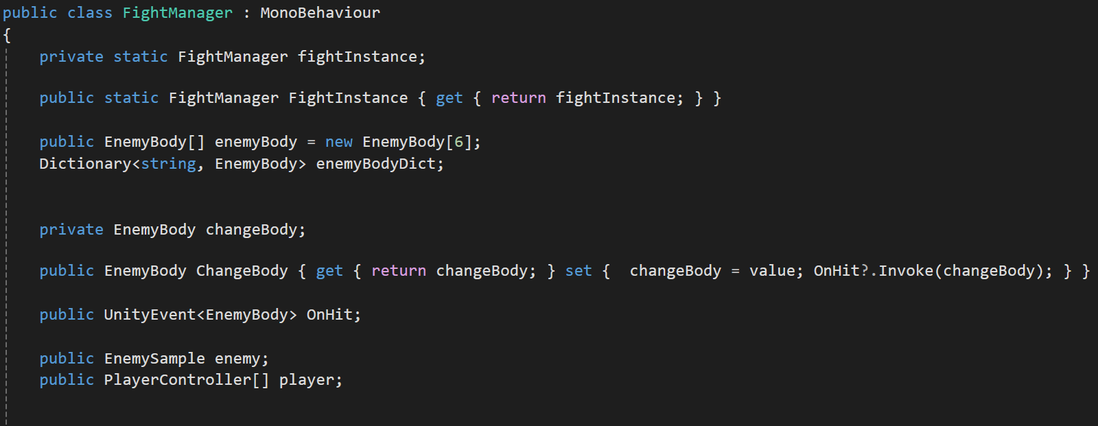 FightManager) 먼저 싱글턴을 구성하고 나서 오브젝트를 생성하겠다 했는데 실수인게 코드를 구성하다 보니 싱글턴을 사용하지 않고 만들 수 있는데 굳이 만든 실수를 하게 되었다.