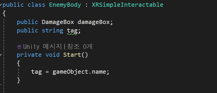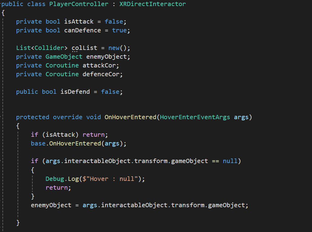 XRBaseControllerInteractor의 OnHoverEntered를 통해 오브젝트가 접촉이 일어날 때 target을 설정하고 그로 인해 Attack함수의 target을 지정하도록 설정하였다.