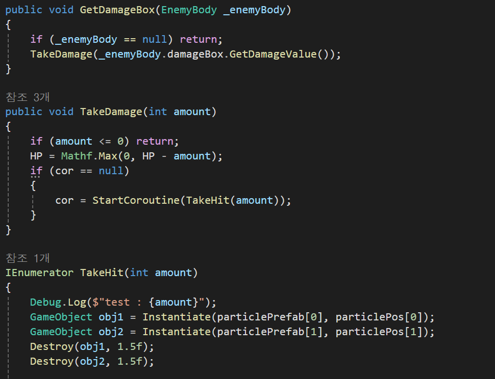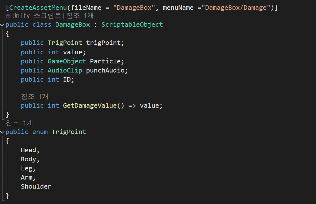 GetDamageBox의 경우에 맞은 부위의 콜라이더에 해당하는 오브젝트를 EnemyBody형식(ScriptableObject를 참조해서 값을 가져옴)으로 사용해서 TakeDamage에 값을 넘긴다.