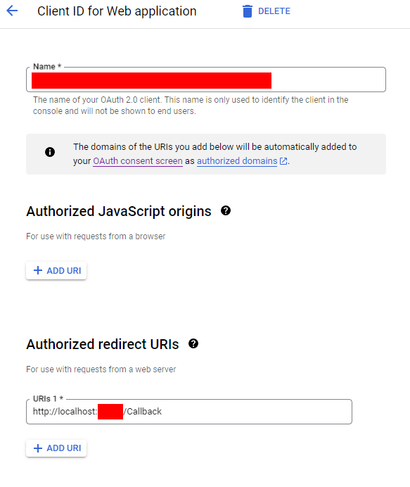 로컬 개발 서버를 사용하는 경우, Authorized redirect URIs로 http://localhost:"port"/Callback 및 http://127.0.0.1:"port"/Callback 을 추가해야 합니다.