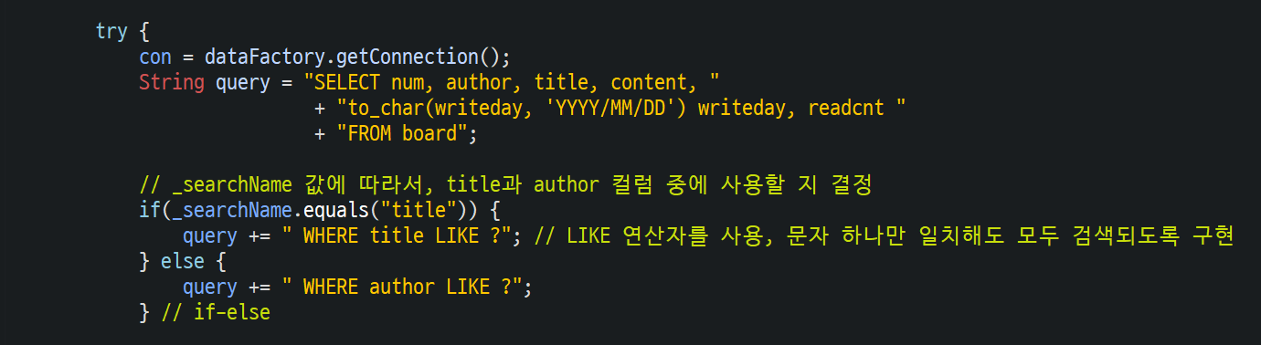 해결 : if문에서, "WHERE title LIKE ?" ----> " WHERE title LIKE ?" 로 수정했다. query문이 띄어져 있어서 연결된다는 점을 잊고 있었다.