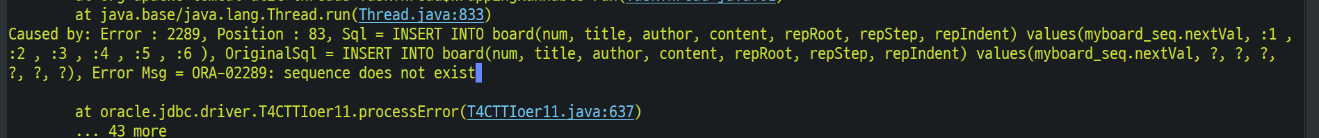 해결 : Sequence명을 "myboard_seq.nextVal" ---> "board_seq.nextVal" 로 수정했다.
