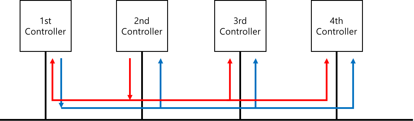 예를 들어, 1번 제어기와 2번 제어기 모두 메시지를 보냈다고 하겠다. 브로드캐스트 방식이기 때문에, 두 메시지 모두 네트워크 전체에 전달되어야 한다. 하지만 1번 제어기와 2번 제어기가 보내는 메시지가 서로 다르기 때문에, 즉, 각 제어기가 만드는 전기적인 신호가 서로 달라 왜곡될 것이다.