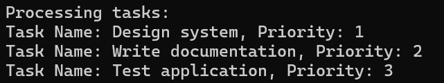 cout << "Task Name: " << name << ", Priority: " << priority << endl;