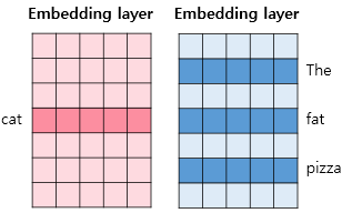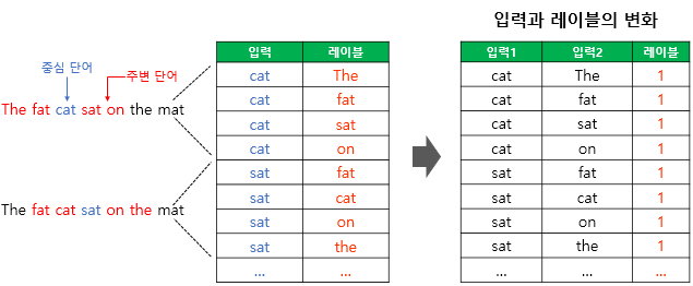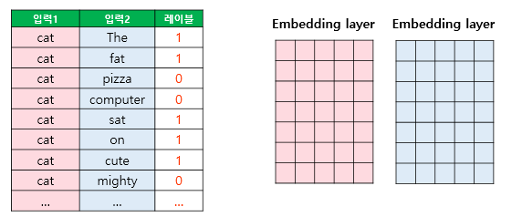 두 테이블 중 하나는 입력 1인 중심 단어의 테이블 룩업을 위한 임베딩 테이블이고, 하나는 입력 2인 주변 단어의 테이블 룩업을 위한 임베딩 테이블이다. 각 단어는 각 임베딩 테이블을 테이블 룩업하여 임베딩 벡터로 변환한다.
