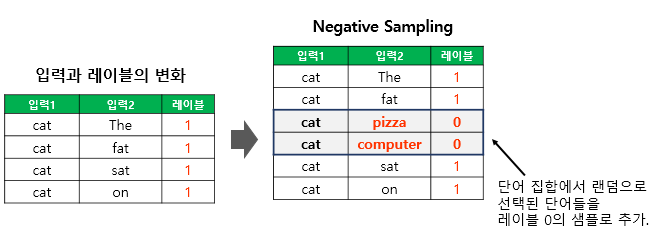 Negative Sampling은 Word2Vec이 학습 과정에서 전체 단어 집합이 아니라 일부 단어 집합에만 집중할 수 있도록 한다. 이렇게 하나의 중심 단어에 대해서 전체 단어 집합보다 훨씬 작은 단어 집합을 만들고, 마지막 단계를 이진 분류 문제로 변환한다. 주변 단어들을 긍정(positive), 랜덤으로 샘플링된 단어들을 부정(negative)으로 레이블링하면 이진 분류 문제를 위한 데이터셋이 된다.