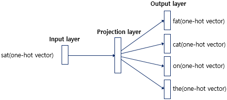 인공신경망을 도식화하면 다음과 같다. 중심 단어로부터 주변 단어를 예측하기 때문에 투사층에서 벡터들의 평균을 구하는 과정은 없다. 여러 논문에 의해, 전반적으로 Skip-gram이 CBOW보다 성능이 더 좋다고 알려져 있다.