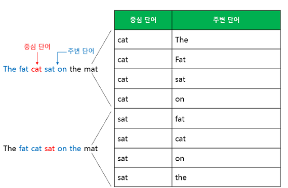 중심 단어를 예측하기 위해, 전후로 몇 개의 단어를 볼 지 정하기 위해 윈도우(window) 라는 범위를 정한다. 예를 들어, 윈도우 크기가 2이었다면, sat 앞의 두 단어 fat, cat, 뒤의 두 단어 on, the가 입력으로 사용된다. 즉, 윈도우 크기가 n이면, 참고되는 주변 단어의 개수는 2n이다.