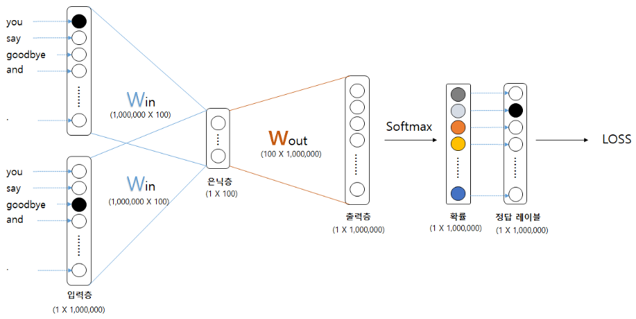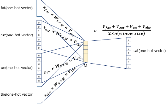 한편, CBOW의 인공 신경망을 도식화하면 다음과 같다.