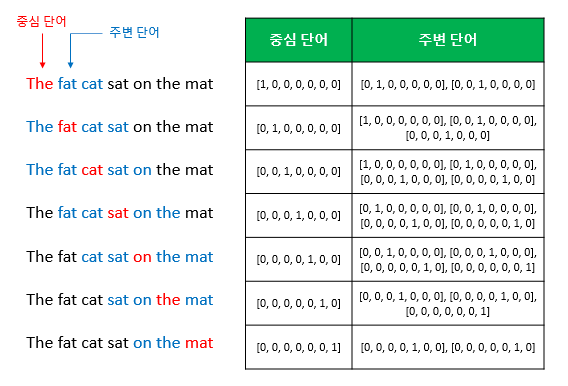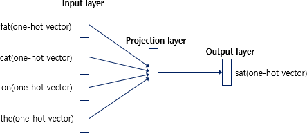 CBOW 방식에 의하면, ['The', 'fat', 'cat', 'on', 'the', 'mat']라는 주변 단어(context word) 로부터 중심 단어(center word) 인 sat을 예측할 수 있다.