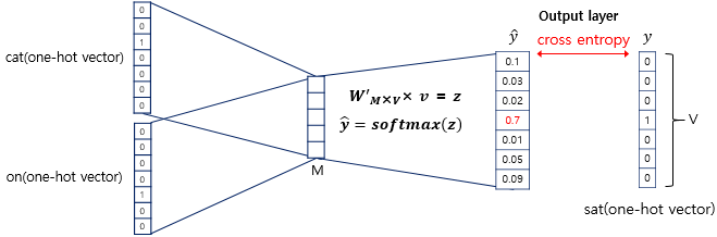 만약 윈도우 크기가 2라면, 중심 단어를 예측하기 위해 총 4개가 입력 벡터로 사용된다. 따라서 평균을 구할 때, 4개의 결과 벡터에 대해 평균 을 구하게 된다. 평균 벡터 은 두 번째 가중치 행렬 와 곱해진다. 곱셈 결과가 Softmax 함수를 지나면서 벡터의 각 원소들의 값은 0과 1 사이의 실수로, 총 합은 1이 된다. 다중 클래스 분류 문제를 위한 일종의 스코어 벡터(score vector) 이다.