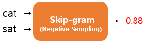 Skip-gram은 중심 단어를 입력 받아 주변 단어를 예측하는 모델이라고 했다. SGNS은 중심 단어와 주변 단어 모두 입력이 되고, 이 두 단어가 실제로 윈도우 크기 내에 존재하는, 이웃 관계인지 그 확률을 예측한다.