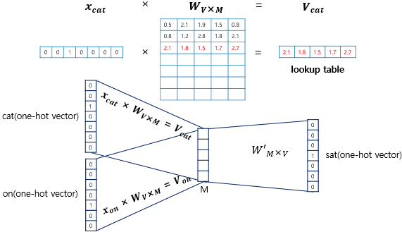 위 그림을 보면, 투사층의 크기가 인 것을 알 수 있다. CBOW에서 투사층의 크기 은 임베딩하고 난 벡터의 차원이 된다. 또한, 입력층과 투사층 사이의 가중치 는 행렬이며, 투사층에서 출력층 사이의 가중치 는 행렬이다. 여기서 은 단어 집합의 크기이며, 두 행렬은 동일한 행렬을 전치한 것이 아니고, 서로 다른 행렬이다. 이렇게 CBOW은 주변 단어로 중심 단어를 더 정확하게 맞추기 위해 와 을 계속해서 학습해간다.