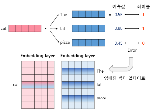 Word2Vec의 출력층에서는 Softmax 함수를 지난 단어 집합 크기의 벡터와 실제값인 one-hot 벡터와의 오차를 구하고, 이로부터 임베딩 테이블에 있는 모든 단어에 대한 임베딩 벡터 값을 업데이트한다. 그런데 단어 집합의 크기가 수만 이상이라면, Word2Vec은 해당 작업을 수행하기에는 너무 무겁다. 예를 들어, Word2Vec은 역전파 과정에서 모든 단어의 임베딩 벡터값의 업데이트를 수행하는데, 만약 현재 집중하고 있는 중심 단어와 주변 단어가 '강아지', '고양이', '귀여운'과 같은 단어라면, 이와 무관한 '돈가스', '컴퓨터' 등 수많은 단어의 임베딩 벡터값까지 업데이트하는 것은 비효율적이다.