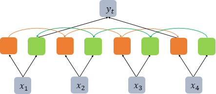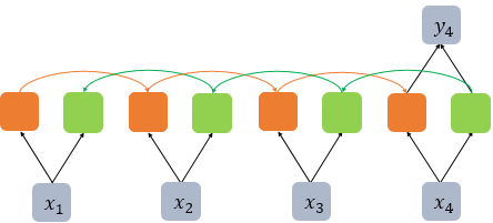 BiLSTM은 두 개의 독립적인 LSTM 아키텍처를 함께 사용하는 구조이다. 위 그림에서 주황색 LSTM 셀은 순차적으로 입력을 받는다. 추가로 뒤의 문맥까지 고려하기 위해, 초록색 셀처럼 오른쪽에서 반대로 읽는 역방향의 LSTM 셀도 함께 사용한다. 이 두 가지 정보를 출력층에서 예측 시에 모두 사용한다.