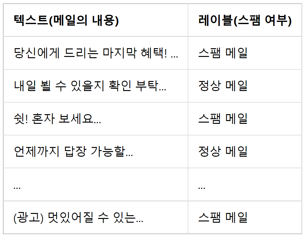 예를 들어, 스팸 메일 분류기의 훈련 데이터의 경우, 메일의 내용과 해당 메일의 스팸 메일 여부가 적혀 있는 레이블로 구성되어 있다. 아래와 같은 형식의 메일 샘플이 약 20,000 개 있다고 가정하겠다.