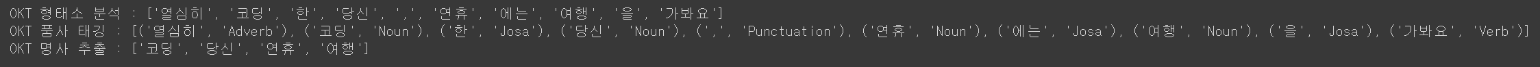 print('OKT 명사 추출:', okt.nouns("열심히 코딩한 당신, 연휴에는 여행을 가봐요"))