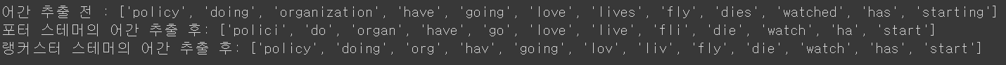 print('랭커스터 스테머의 어간 추출 후:',[lancaster_stemmer.stem(w) for w in words])