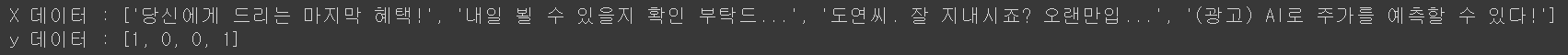 values = [['당신에게 드리는 마지막 혜택!', 1], ['내일 뵐 수 있을지 확인 부탁드...', 0], ['도연씨. 잘 지내시죠? 오랜만입...', 0], ['(광고) AI로 주가를 예측할 수 있다!', 1]]