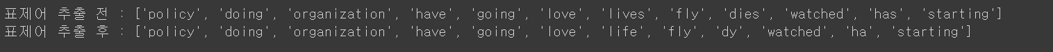 print('표제어 추출 전 :',words)