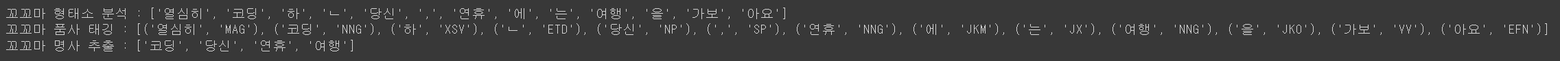 print('꼬꼬마 품사 태깅 :',kkma.pos("열심히 코딩한 당신, 연휴에는 여행을 가봐요"))
