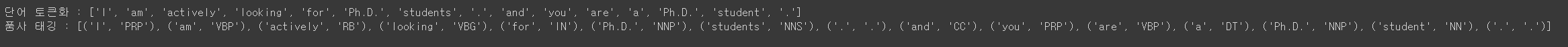 print('품사 태깅: ', pos_tag(tokenized_sentence))
