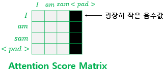 따라서 Key에 <PAD> 토큰이 존재하는 경우, 이에 대해서는 유사도를 구하지 않도록 마스킹(masking)을 적용해야 한다. 여기서 마스킹이란 어텐션에서 값을 가려서 제외하는 것을 의미한다.