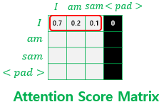 Softmax 함수를 거친 후, 마스킹 위치의 값은 이 된다. 결과적으로 <PAD> 토큰은 어텐션 가중치에 반영되지 않는다. 각 행의 어텐션 가중치 총합은 이며, <PAD> 열의 가중치만 이다.