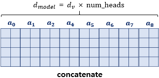 모든 병렬 어텐션을 수행한 후에는 모든 어텐션 헤드를 연결(concatenate)한다. 이렇게 연결된 어텐션 헤드 행렬의 크기는 다시 이 된다. 그리고 이 어텐션 헤드 행렬에 가중치 행렬 를 곱한다. 이에 따라 도출된 행렬이 멀티-헤드 어텐션의 최종 결과물이다.