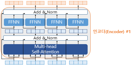 하나의 인코더 층은 크게 총 2개의 서브층으로 나뉘는데, 이들은 멀티 헤드 셀프 어텐션과 포지션 와이즈 피드 포워드 신경망이다. 즉, FFNN은 멀티 헤드 어텐션 다음으로 오는 두 번째 서브층에 해당한다. FFNN은 어텐션 층에서 나온 결과를 변환하여 다음 층으로 전달하는 역할을 수행한다.