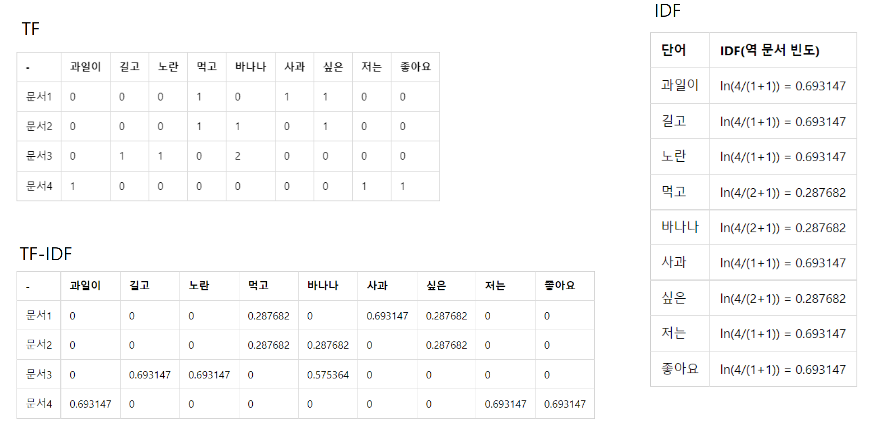 TF-IDF은 TF와 IDF을 곱한 값을 의미한다. 문서를 , 단어를 , 문서의 총 개수를 이라고 표현하면 TF, DF, IDF는 각각 다음과 같이 정의할 수 있다.
