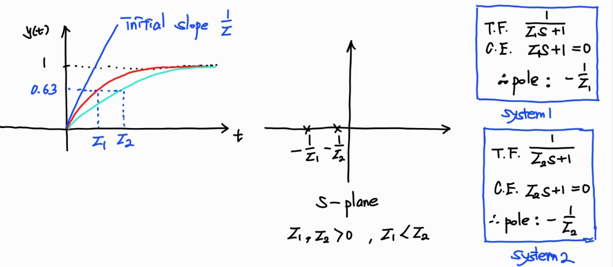 τ \tau τ 가 커질수록 시스템 응답은 느려진다. 즉, pole의 위치가 점점 imaginary axis에 가까워진다. 이를 통해, time constant τ \tau τ 은 시스템의 속도를 알려준다.