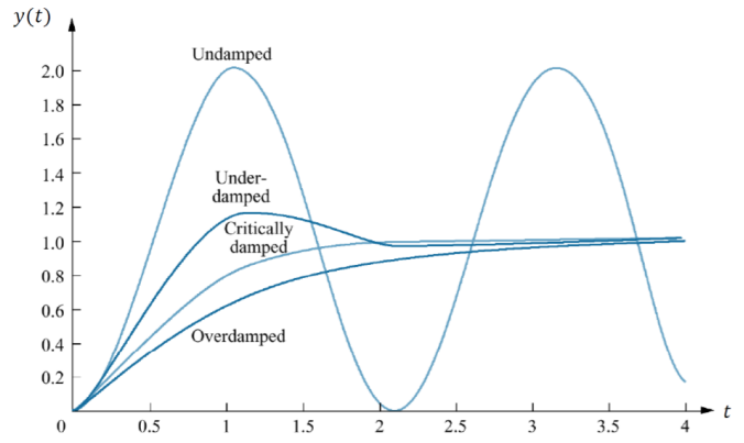 y ( t ) = 1 − e − ζ w n t 1 − ζ 2 sin ( w d + β ) y(t)=1-\frac{e^{-\zeta w_nt}}{\sqrt{1-\zeta^2}}\sin{(w_d+\beta)} y ( t ) = 1 − 1 − ζ 2 e − ζ w n t sin ( w d + β )
