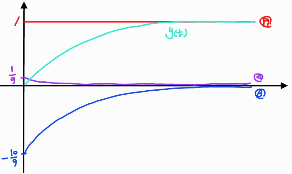 ⇒ y ( t ) = 1 − 10 9 e − t + 1 9 e − 10 t \Rightarrow y(t)=1-\frac{10}{9}e^{-t}+\frac{1}{9}e^{-10t} ⇒ y ( t ) = 1 − 9 1 0 e − t + 9 1 e − 1 0 t