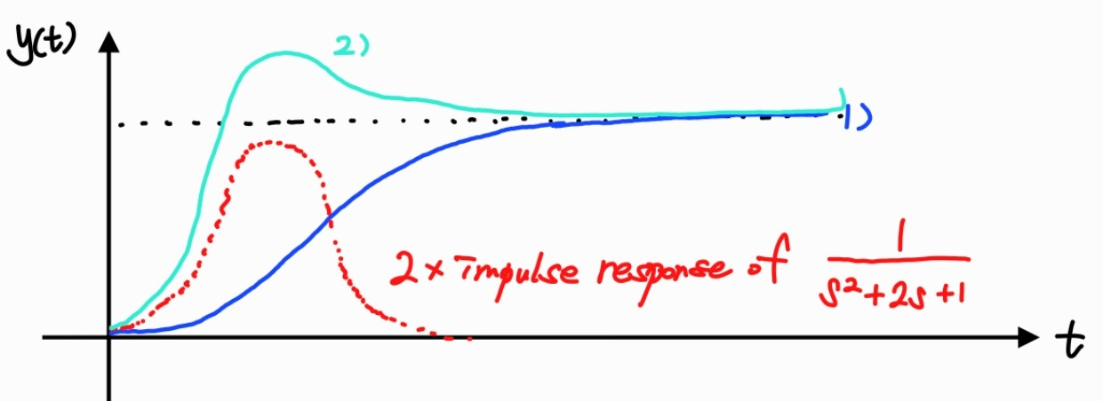 2) Y ( s ) U ( s ) = 2 s + 1 s 2 + 2 s + 1 ⇒ Y ( s ) = 2 s 2 + 2 s + 1 + 1 s 2 + 2 s + 1 ⋅ 1 s \frac{Y(s)}{U(s)}=\frac{2s+1}{s^2+2s+1} \Rightarrow Y(s)=\frac{2}{s^2+2s+1}+\frac{1}{s^2+2s+1}\cdot\frac{1}{s} U ( s ) Y ( s ) = s 2 + 2 s + 1 2 s + 1 ⇒ Y ( s ) = s 2 + 2 s + 1 2 + s 2 + 2 s + 1 1 ⋅ s 1