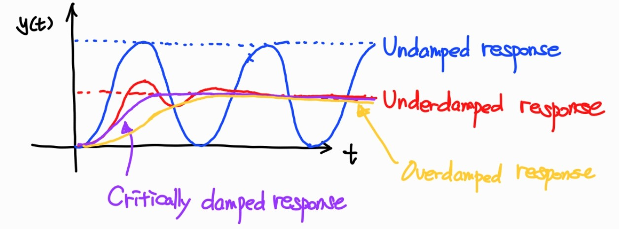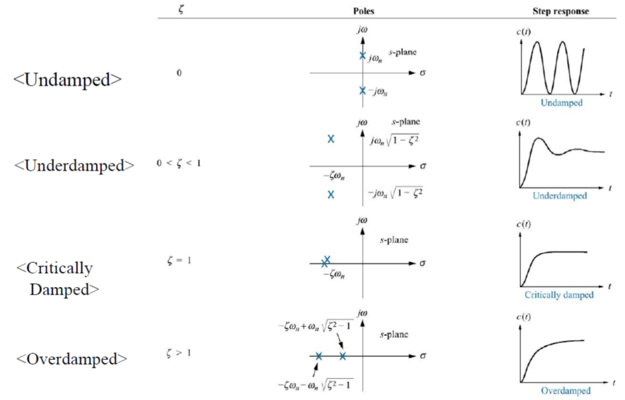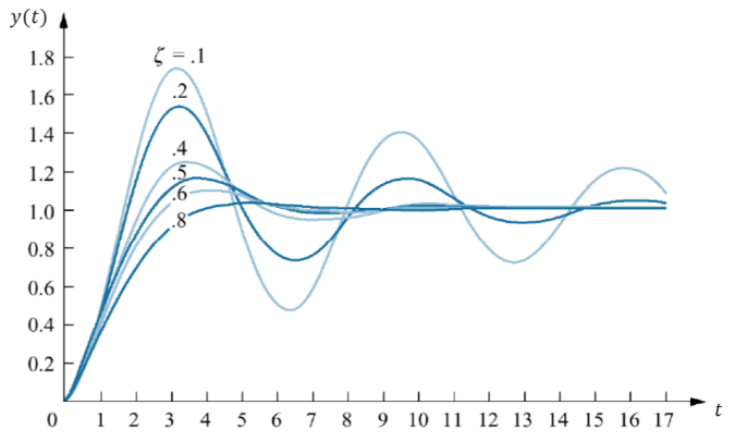 Unit-step response: Y ( s ) = w n 2 s 2 + 2 ζ w n s + w n 2 ⋅ 1 s Y(s)=\frac{w_n^2}{s^2+2\zeta w_ns+w_n^2}\cdot\frac{1}{s} Y ( s ) = s 2 + 2 ζ w n s + w n 2 w n 2 ⋅ s 1