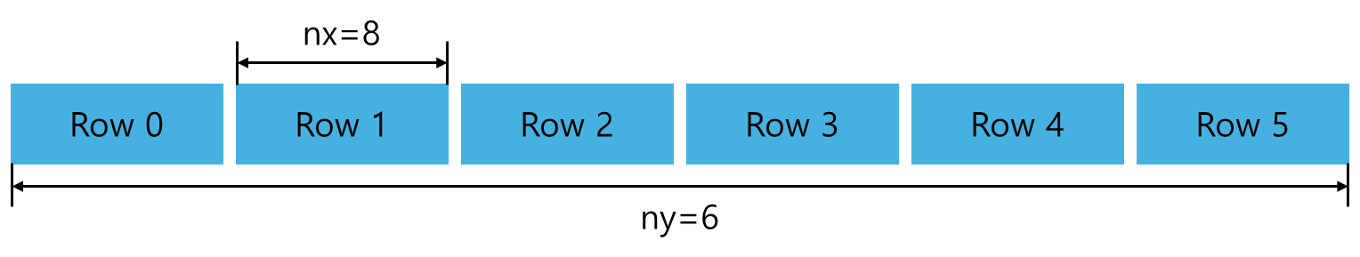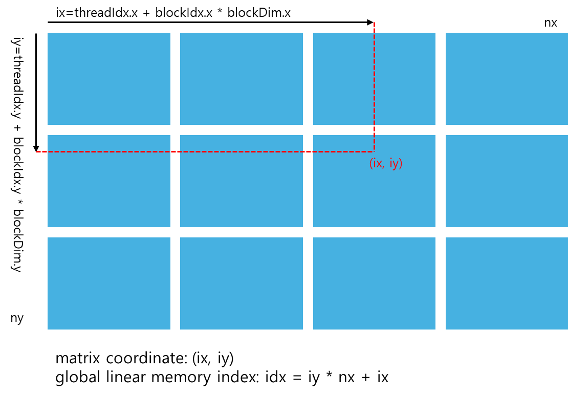 dim3 grid((nx + block.x - 1) / block.x, ny);