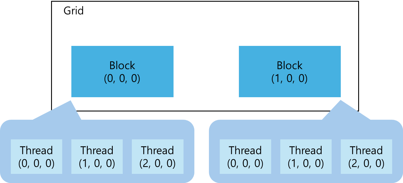 보통, grid는 2차원 배열의 blocks으로 구성되고, block은 3차원 배열의 threads로 구성된다. grids와 blocks 모두 dim3 타입의 unsigned integer fields이며, 사용되지 않는 fields는 1로 초기화되고 무시된다.