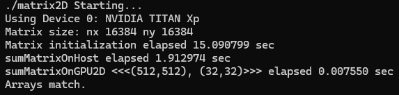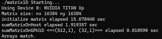 sumMatrixOnGPU1D<<<grid, block>>>(d_MatA, d_MatB, d_MatC, nx, ny);
