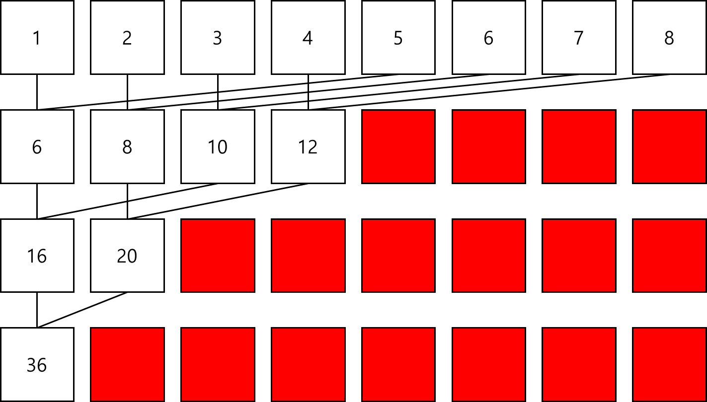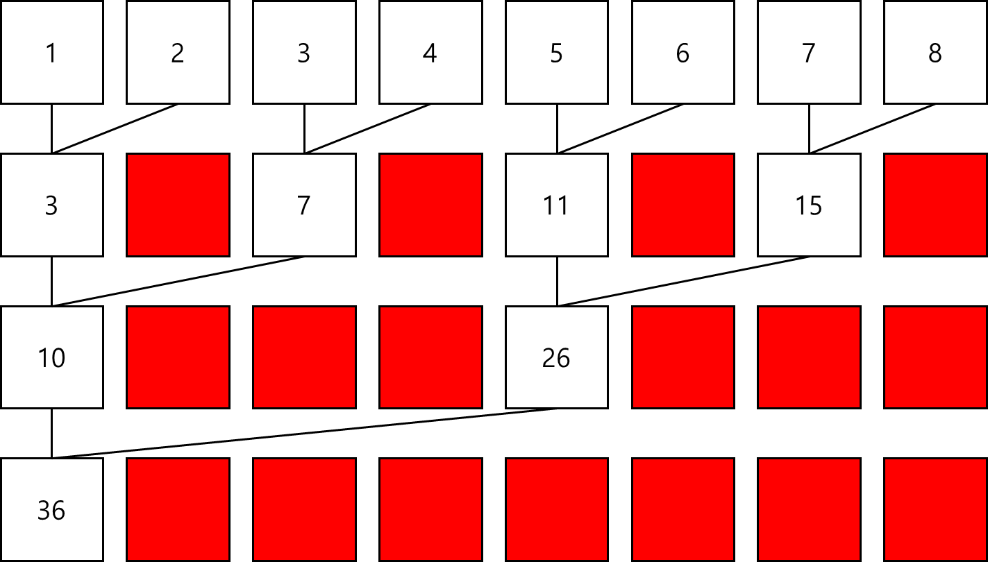 덧셈은 결합 법칙과 교환 법칙이 성립하므로, 위 코드에서 N이 굉장히 큰 수라면, 위 배열은 어떠한 순서로 더하든 결과에는 변함이 없다. 따라서 다음의 방법으로 덧셈을 병렬적으로 수행하면 된다.