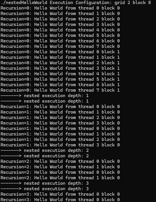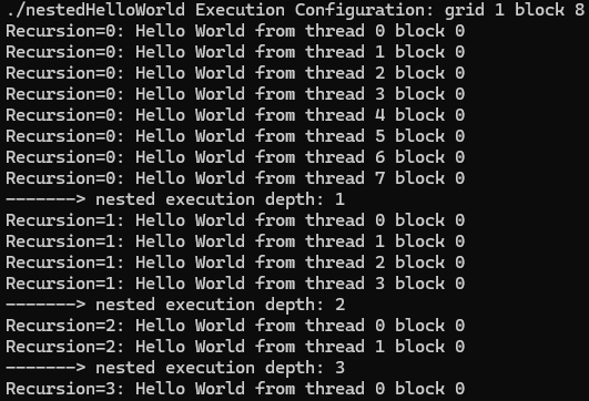 nestedHelloWorld<<<1, nthreads>>>(nthreads, ++iDepth);