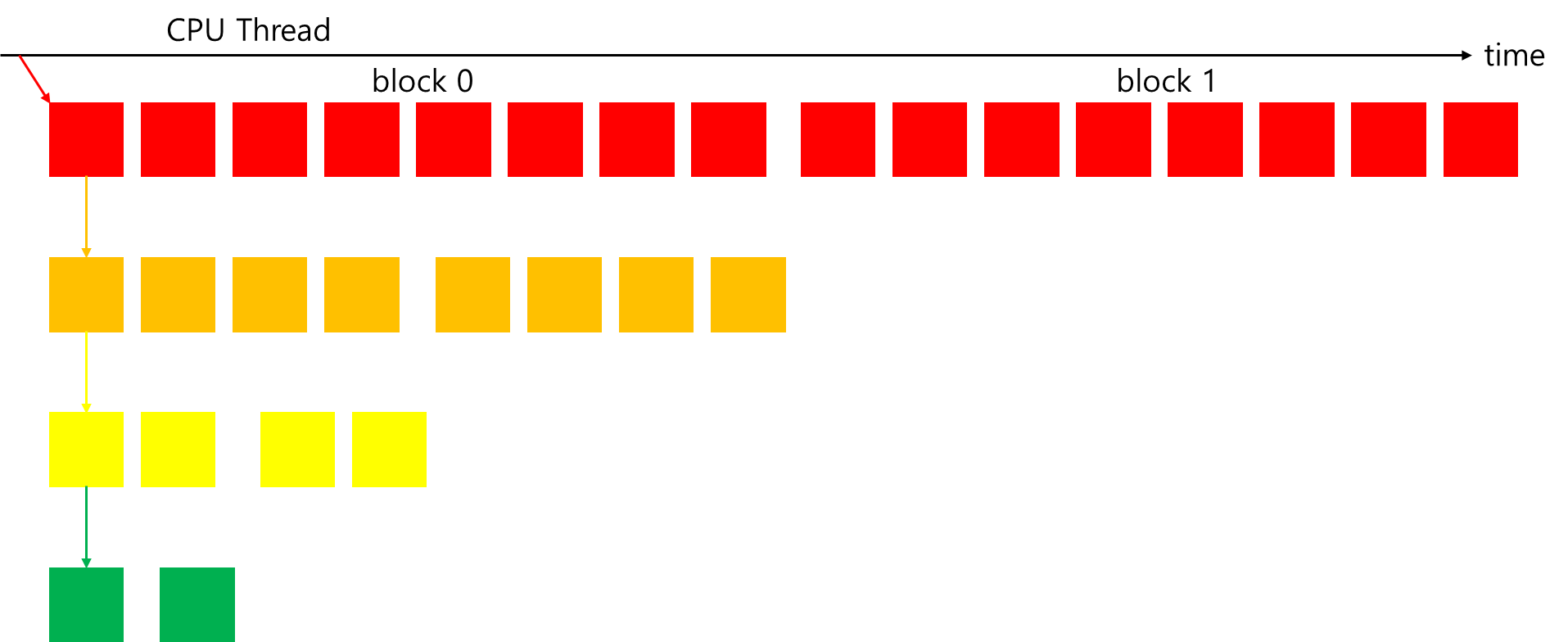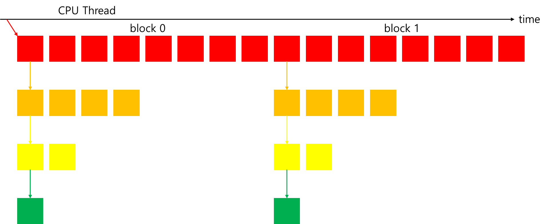 그런 다음, thread 0이 현재 block의 절반 크기의 thread를 가지는 하나의 thread block을 포함하는 child grid를 생성한다. child grid가 호출된 후, 모든 child grid에 대한 barrier point가 설정된다. 각 block의 하나의 thread에 의해 하나의 child grid만 생성되므로, 이 barrier point는 하나의 child grid와만 동기화된다.