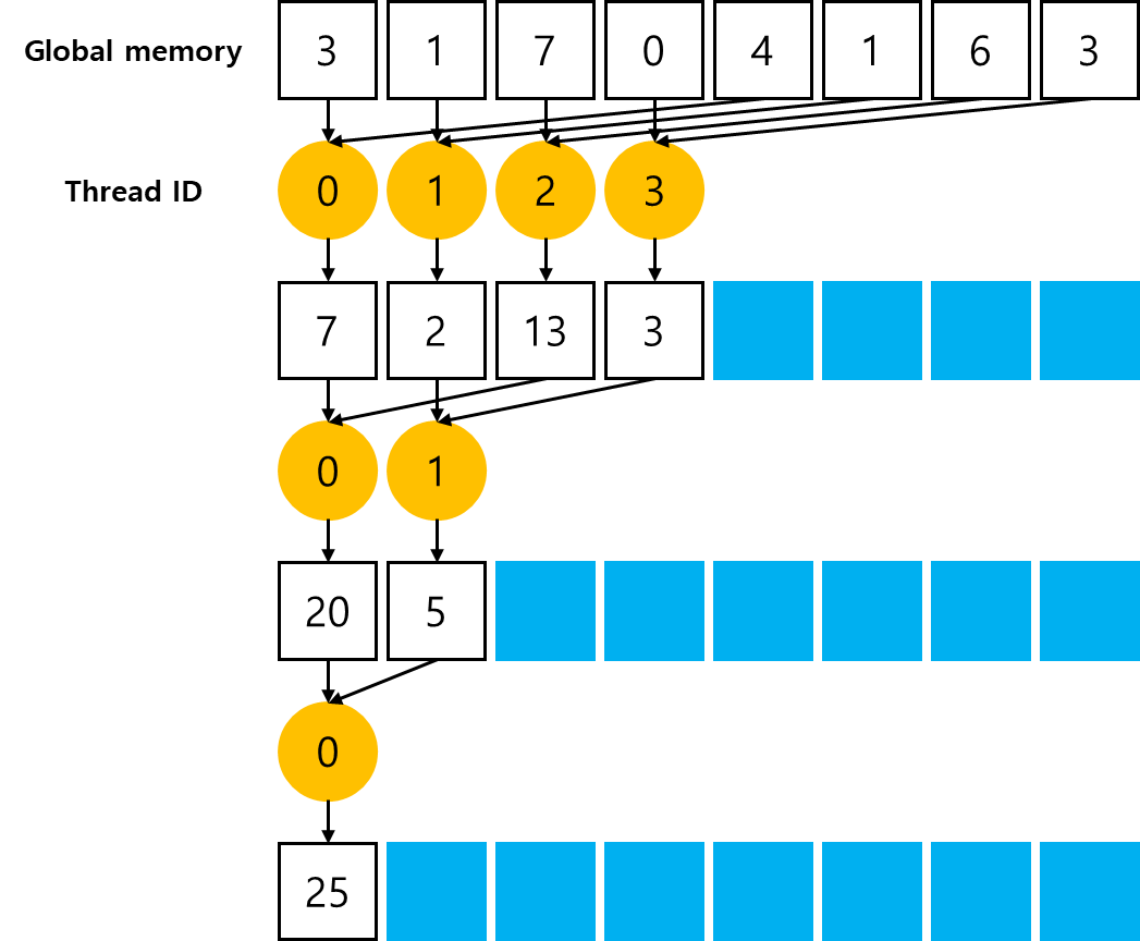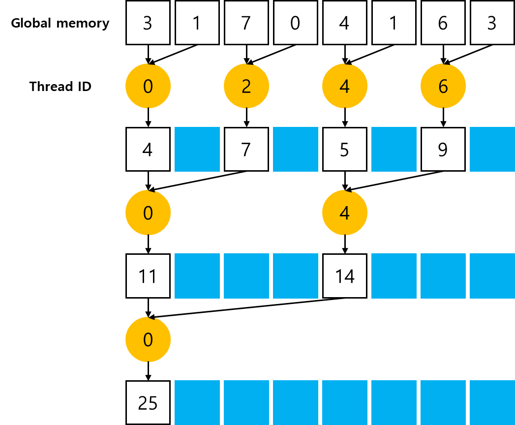 이웃한 요소 간 거리 stride 는 처음에 1로 초기화된다. 각 reduction round 후 stride 는 두 배 증가한다. 첫 번째 단계 후, 'idata'의 짝수 번째 요소는 부분합으로 대체된다. 두 번째 단계 후, 'idata'의 4배수의 요소마다 부분합으로 대체된다. thread block 간 synchronization이 없기 때문에 각 thread block에 의해 생성된 부분합은 host로 복사되고, 그 곳에서 순차적으로 더해진다.